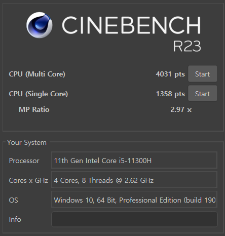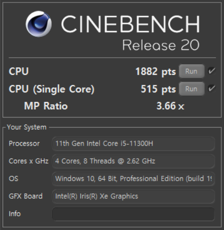 Cinebench는 CPU의 성능을 100% 활용해서 특정 이미지를 얼마나 빠르게 렌더링 하는지 여부를 평가하는 항목. 최신 R23 버전이 테스트 시간이 가장 길기 때문에 발열로 인한 성능 차이가 하위 버전보다 더 뚜렷하게 나타나는 경향이 있다. 싱글코어 테스트는 대체로 발열과 크게 관계가 없는 편이다.