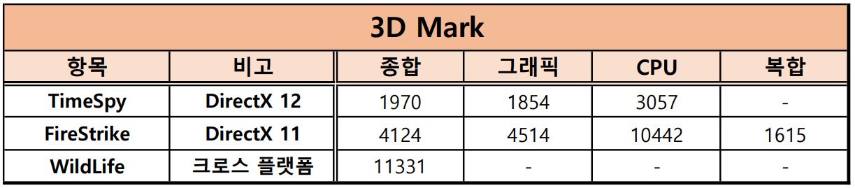 3D Mark는 일반적으로 게임에서 사용되는 Direct X 방식의 그래픽 성능을 중점적으로 평가하는 항목이다. 최신 하드웨어는 TimeSpy 테스트가 대체로 사용자 체감 성능과 비례하는 경향이 강하고, FireStrike는 구형 벤치마크라서 정확도가 떨어지는 추세.