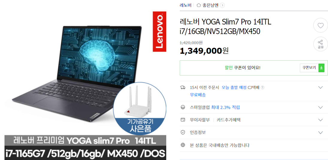 - 14인치 / i7-1165G7 / MX450 / 16GB / 512GB / 프리도스 / 약 127만원 -