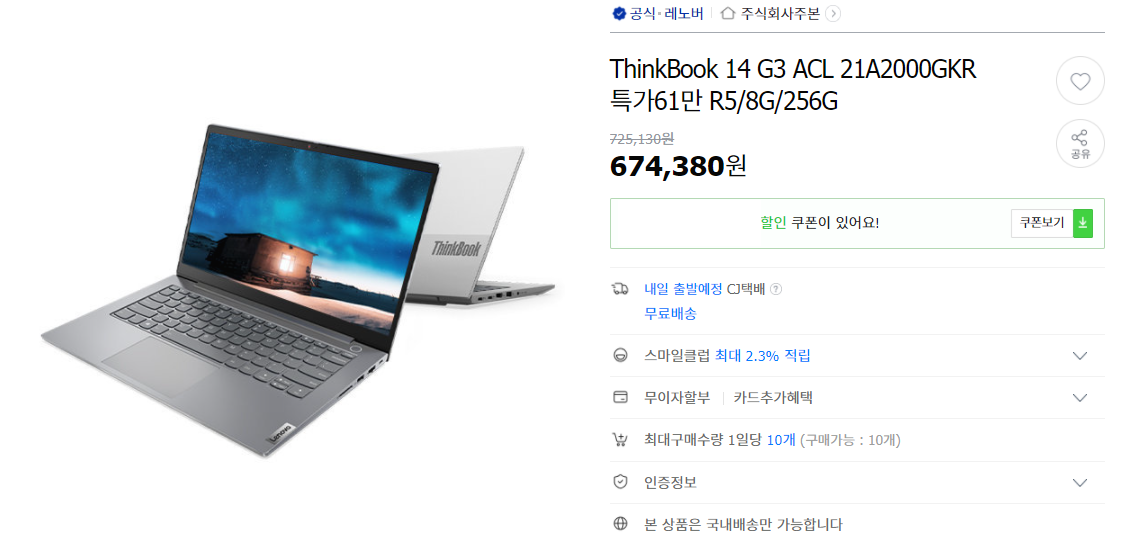 - 14인치 / R5-5500U / 8GB / 256GB / 프리도스 / 약 61만원 -