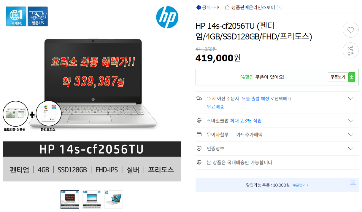 HP의 저가형 모델입니다. 어차피 마감이나 디자인이 썩 좋지 못한 녀석이라 고스펙으로 구매하는 것은 추천드리지 않는 녀석이기도 해요. 급하게 문서 작업, 인터넷만 적당히 돌아갈 초저렴이 모델이 필요하신 분들은 고려해볼 만합니다. 다만 램 업그레이드는 거의 필수이고, 사용 목적에 따라 SSD 추가 장착도 필요할 수 있어요.