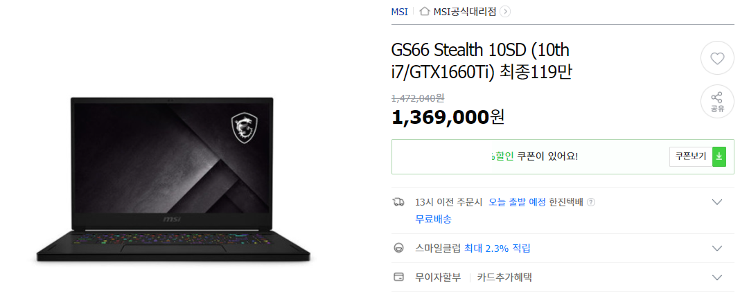 MSI가 가끔 세대교체 시기에 기존 재고 정리할 때 할인 폭을 크게 때리는 경우가 가끔 있습니다. 이번 GS66 모델도 그런 경우인데, 나름 MSI의 고급형 경량 게이밍 노트북이라서 이 사양으로 초기에 출시될 당시 180만원 정도 하던 녀석이에요.