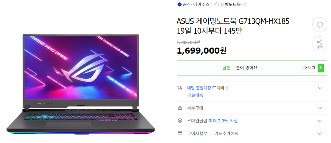 - 17인치 / R9-5900HX / RTX3060 / 8GB / 512GB / 프리도스 / 약 145만원 -