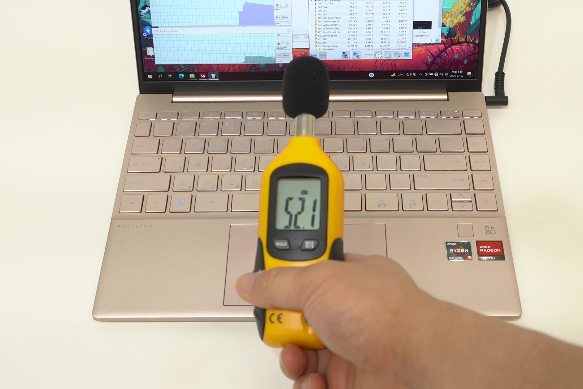 아주 짧은 시간 동안 CPU가 25W로 부스팅 될 때에는 팬 소음이 52.1dB 정도로 매우 시끄럽습니다. 어지간한 작업 중에는 이 정도로 소음이 올라갈 일은 없고, 조용한 환경에서 순간적인 소음 증가가 걱정되신다면 노트북 성능을 균형 모드로 설정해두시면 최대 터보 부스트로 올라가지 않아요.