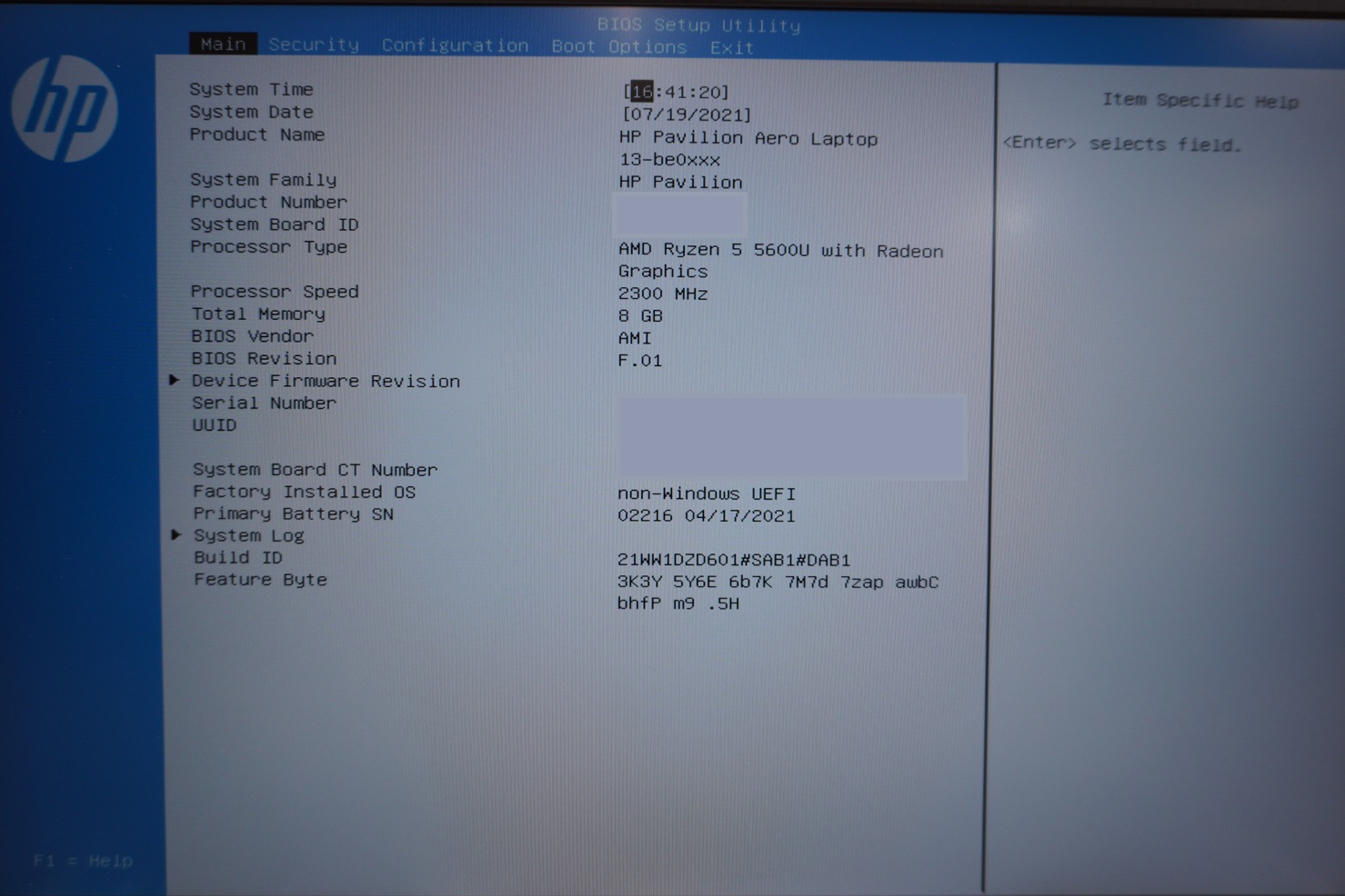 HP 노트북은 부팅 화면에서 바이오스로 진입하는 단축 버튼이 F10입니다. 파빌리온 에어로13은 중저가형 모델이라 그런지 바이오스 옵션은 딱 기본적인 항목 외에는 없네요.