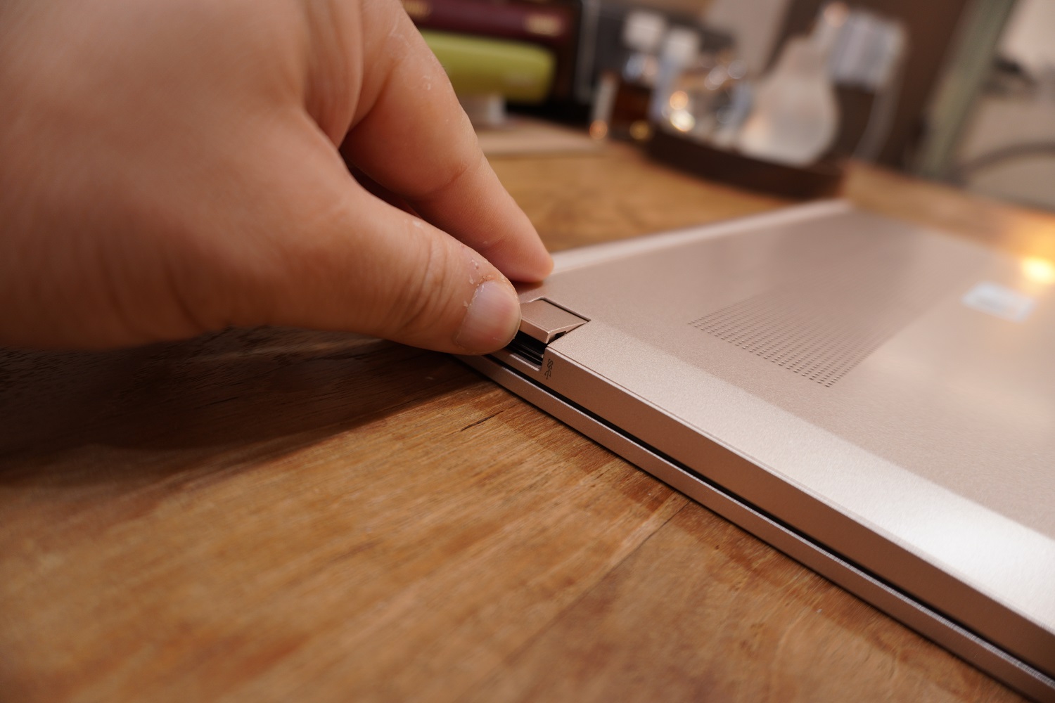 그런데 USB-A 포트가 악어 턱 같은 스프링 구조물로 반쯤 가려져 있는 구조라 USB-A 장치를 연결할 때마다 신경을 써서 해당 부분을 눌러주면서 끼워야 한다는 점이 조금 번거롭더라고요. 장기간 사용할 경우 해당 구조물의 스프링 내구성도 조금 걱정이 되기도 하고요. 아마도 파빌리온 에어로13의 마그네슘 프레임의 강도 때문에 측면에 USB-A의 크기만큼 구멍을 뚫지 못한 것이 아닐까 싶긴 합니다.
