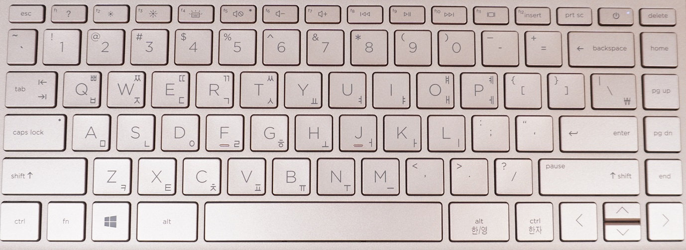 HP가 미국 제조사라서 그런지, 비영어권 키보드 배열에 대한 배려가 상당히 부족한 편입니다. 파빌리온 에어로13도 스페이스바가 지나치게 길어서 한/영 버튼을 누를 때 의식적으로 엄지를 많이 굽혀야 한다는 점이 상당히 불편하더라고요. 이건 이전에 리뷰했던 HP 오멘15 게이밍 노트북에서도 지적했던 부분이었습니다.