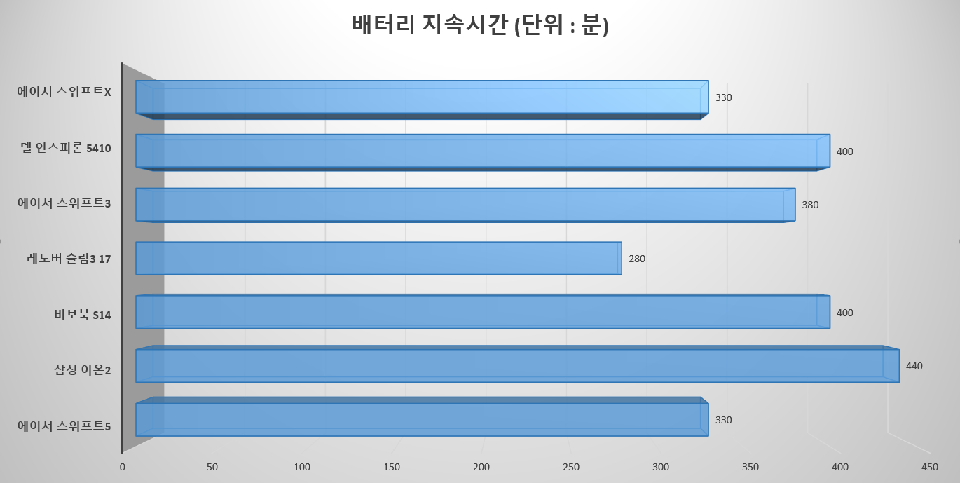 제가 스위프트x를 가볍게 블로그 편집, 유튜브 시청 용도로 사용할 경우 5시간 반 정도 버텨주더라고요. 저는 개인적으로 휴대용 노트북에서 6시간 이상의 사용시간을 기대하는 편이지만, 그래도 이 정도면 무게와 사양을 감안해서 납득할 수 있는 범주 내라고 생각해요.