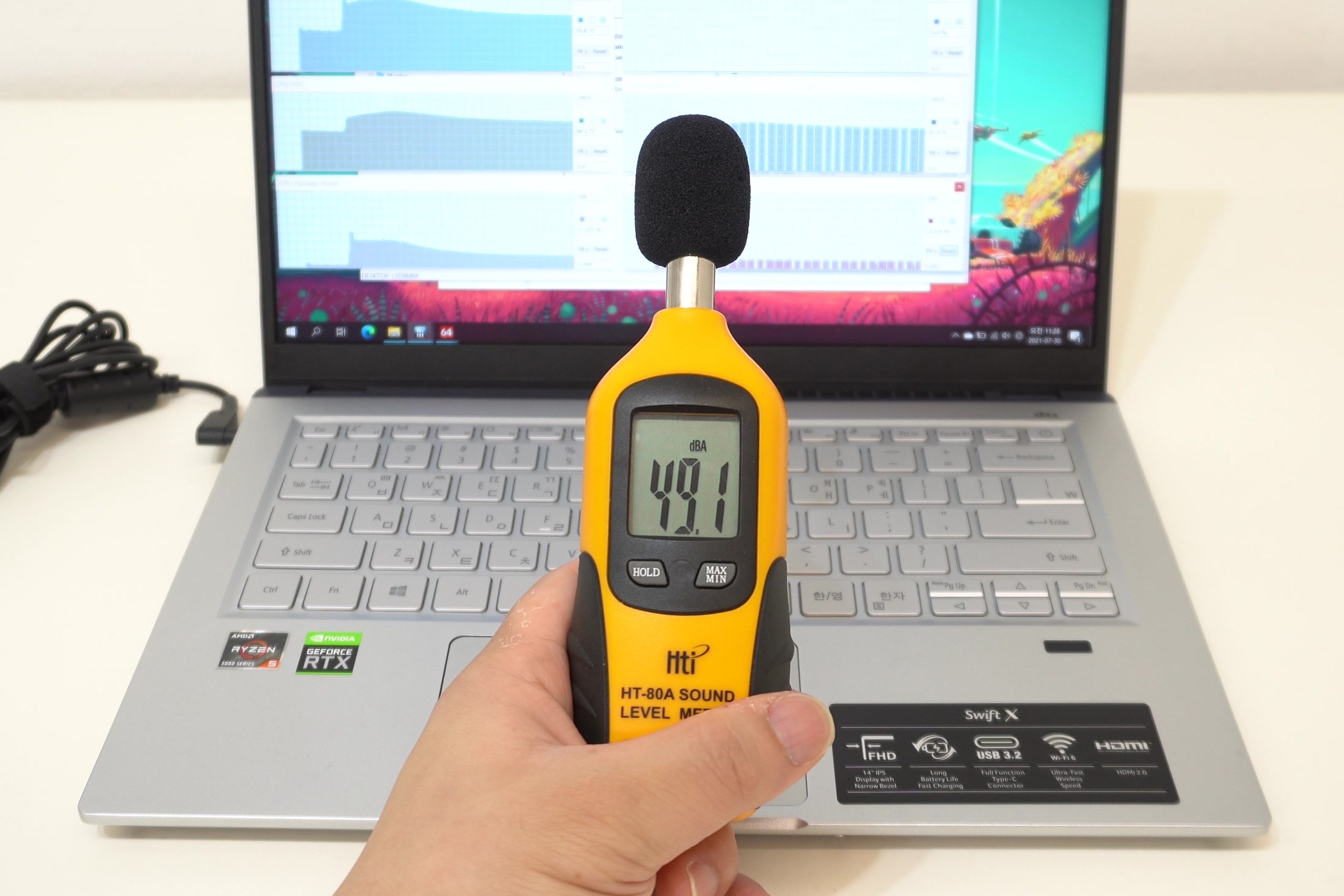 고성능 작업이나 게임 도중에 팬 소음이 제법 시끄러운 편입니다. 보통 소음 제어가 괜찮은 게이밍 노트북이 50dB 정도니까, 스위프트x의 49.1dB은 거의 게이밍 노트북 수준이라고 봐도 되겠죠. 가벼운 설계에 고성능 GPU를 탑재했기 때문에 어쩔 수 없는 물리적인 한계라서 개인적으로 큰 단점이라고 지적하기는 어려울 것 같아요.