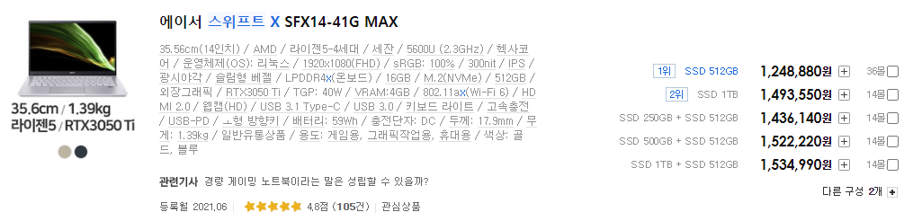 오늘출발 스위프트x SFX14-41G 3050Ti MAX[세잔R5-5600U/16G/512G/14' sRGB100%/1.39kg