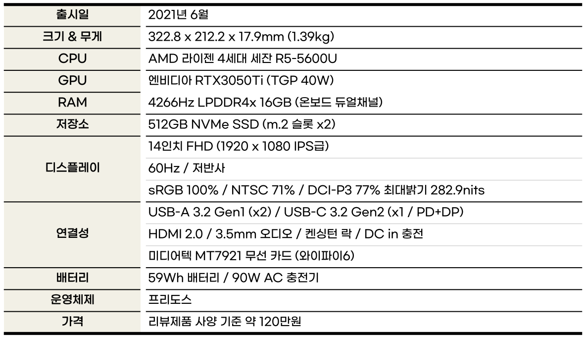"정성비 좋은 라이젠 세잔 CPU와 RTX3050Ti는 환상의 조합. 저전력 노트북으로 이 정도 성능을 뽑아냈다는 점은 칭찬할만하다"