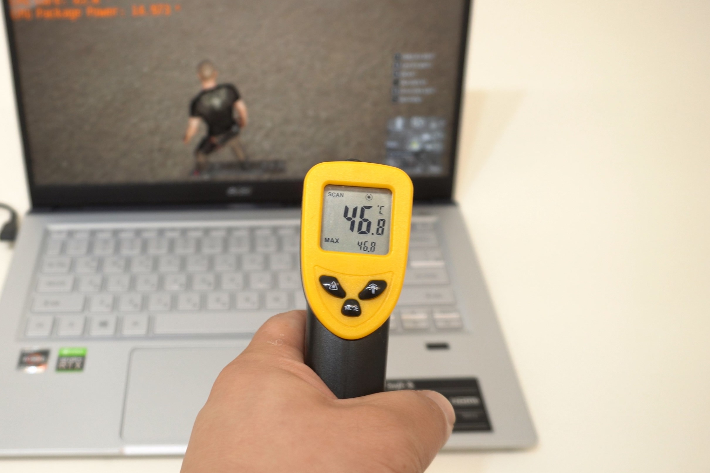다만 고사양 작업 중에 키보드 표면 온도가 상당히 많이 뜨거워진다는 점은 불편하게 느껴졌습니다. 요즘은 대부분 노트북들이 내부 설계가 잘 돼있어서 표면 온도가 40℃ 이내로 유지되는 경우가 많은데, 스위프트x는 WASD 키 주변과 F7 키 주변이 44~47℃ 사이로 측정이 되더라고요.