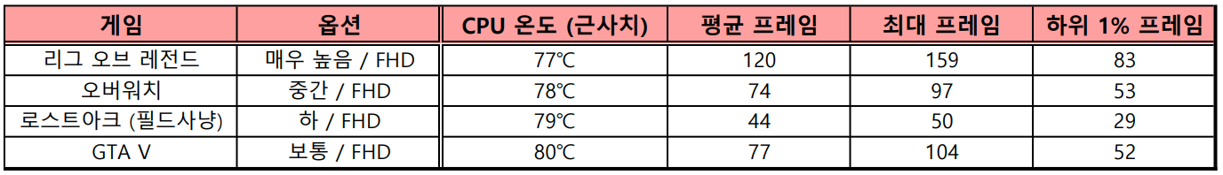 결국 리그 오브 레전드 같은 저사양 게임은 쾌적, 오버워치 같은 중저사양 게임은 옵션 타협해서 충분히 즐길 수준이라는 점에서 저전력 라이젠 노트북들과 게임 성능이 크게 차이 나지는 않습니다. 쿨링 설계 덕분에 평균 프레임이 조금 더 높게 측정됐지만, 플레이할 수 있는 타이틀 자체가 달라지는 수준은 아니에요.