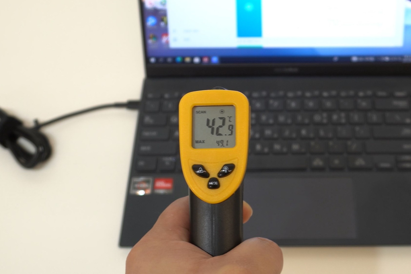 다만 고사양 작업을 할 때의 노트북 표면 온도가 상당히 높게 올라가더라고요. 게임을 구동하거나 스트레스 테스트를 하는 중에 F7 상단분의 표면 온도가 무려 50도까지 올라가서 만지기 어려운 수준이었고, WASD 키 주변도 42도 이상 올라가서 장시간 사용하기에는 불편함이 느껴졌습니다.