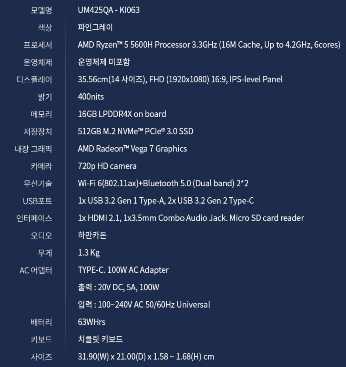 [재고보유][최종99만]ASUS 젠북14 UM425QA-KI063/세잔R5-5600H/512GB/16GB/PD충전