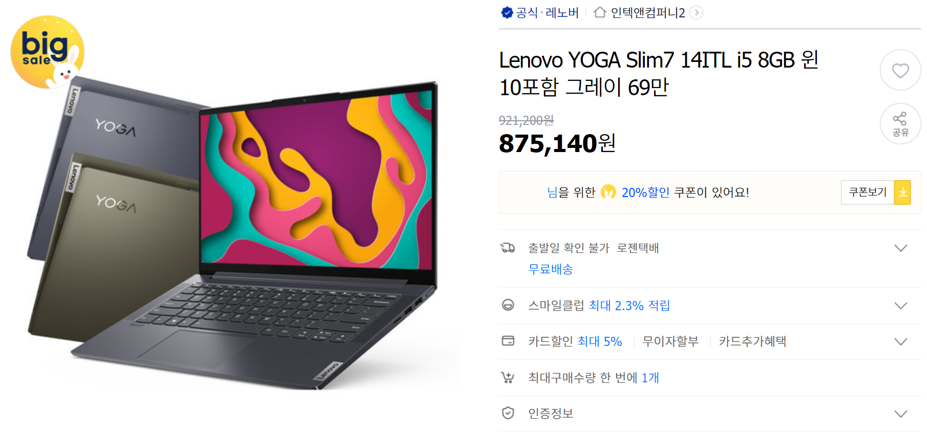Lenovo YOGA Slim7 14ITL i5 8GB 윈10포함 그레이 69만