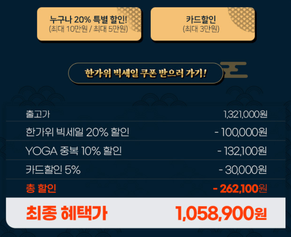원래 노트북 세일은 지마켓이 최고봉 수준이었는데, 요즘은 예전만 못한 것 같아요. 이번에도 한가위를 명목으로 "빅세일" 이벤트를 진행하긴 하는데 파격적인 특가는 딱히 보이지 않았습니다. 물론 요즘 노트북 시세가 오른 것도 감안을 해야겠지만요.