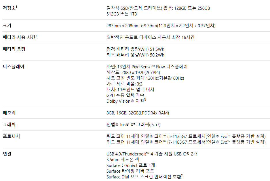 사양은 인텔 11세대 저전력 CPU에 내장그래픽 조합이고, i3 모델을 제외하면 Xe 내장그래픽을 사용하고 있습니다. 조만간 인텔 12세대 엘더레이크 CPU가 출시될 예정이라 11세대 끝물이라는 점이 조금 아쉽지만, 서피스 프로 시리즈의 용도를 생각하면 나쁜 성능은 아니라서 큰 문제는 없을 것 같네요.