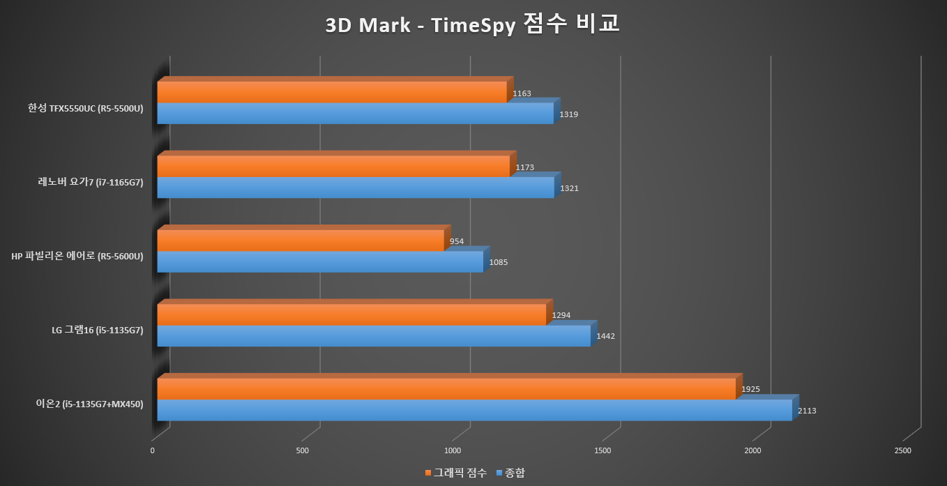 분명 내장그래픽의 한계는 뚜렷하지만, 그래도 내장그래픽 저전력 노트북 중에서는 수준급 점수라고 평가할 수 있겠습니다.