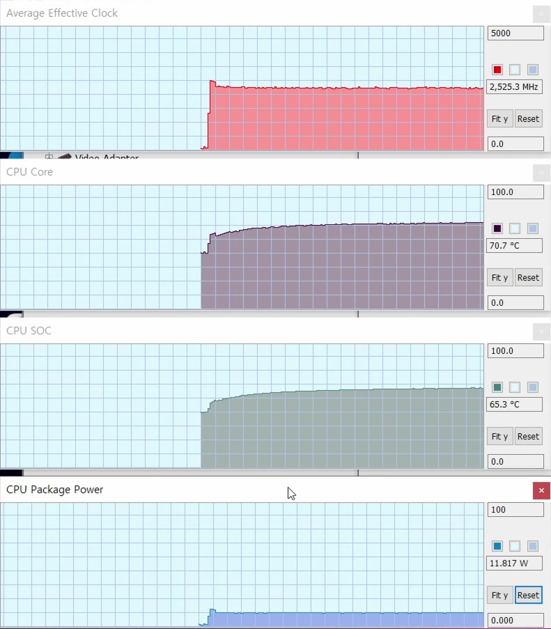 고성능 모드 기준 라이젠 저전력 CPU의 피크 전력 값인 25W를 안정적으로 유지할 수 있었습니다. 대부분 저전력 노트북은 18~20W 정도 기준으로 설계가 된다는 점을 생각하면 상당히 높은 값이라고 할 수 있겠죠. 그 대신 팬 소음이 무려 54.9dB로, 어지간한 게이밍 노트북보다 더 시끄러운 수준이라서 어지간하면 엔터테인먼트 모드로 사용하시는 것을 추천드리고 싶습니다.