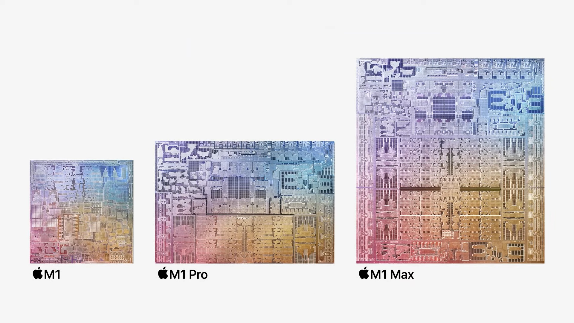 하지만 초기 M1 칩은 결국 휴대용 노트북 용도의 저전력 프로세서이기 때문에 본격적인 워크스테이션 수준의 성능에 미치지는 못했습니다. 그래서 애플이 기존의 고성능 16인치급 맥북 프로를 대체할 수 있는 M1x 칩을 개발하고 있다는 소문이 한참 돌았었는데, 이번 발표에서 M1 프로, M1 맥스라는 2개의 제품군으로 구분해서 출시를 했습니다.