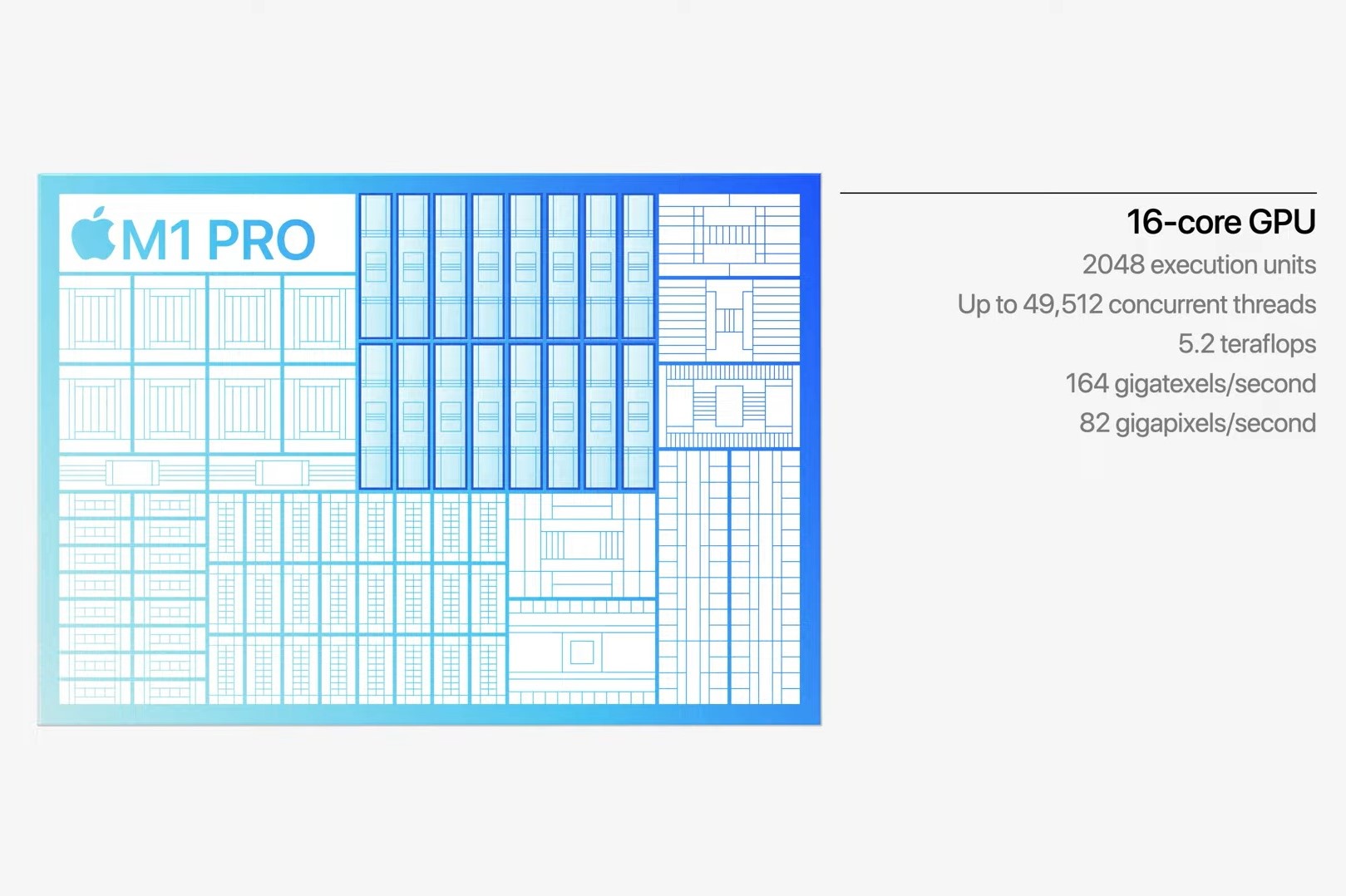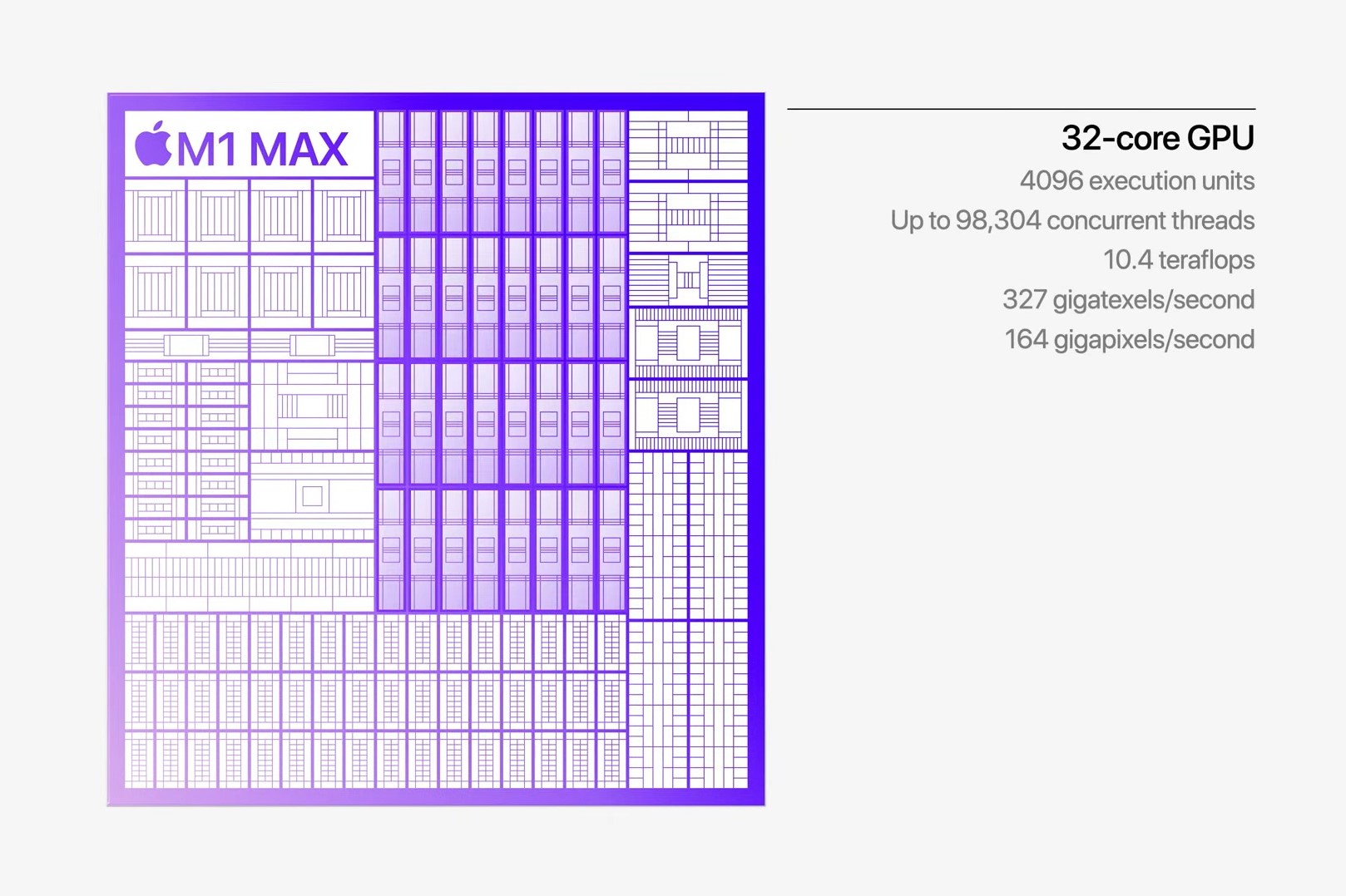 그리고 M1 프로와 맥스는 전문가 작업 용도로 설계되어 있기 때문에 GPU 코어 구성 방면에서 큰 차이를 보여줍니다. 기존 M1 칩은 GPU가 7~8코어 구성이었던 반면, M1 프로는 16코어, 그리고 M1 맥스는 32코어를 지원합니다. 기존 M1 칩의 약점이라고 지적받던 제한적인 그래픽 성능 문제가 해결된 것이라고 볼 수 있겠죠.