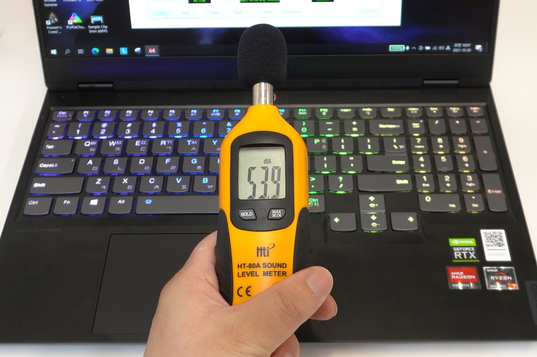 팬 소음은 평균적인 게이밍 노트북 수준입니다. 극한 성능 모드에서 최대 소음이 55dB을 넘지 않기 때문에 심하게 거슬리지는 않았어요. 요즘 TGP가 높게 설정된 게이밍 노트북들은 소음이 60dB에 가깝게 올라가는 경우도 제법 많으니 이 정도면 준수한 편이라고 평가할 수 있겠죠.