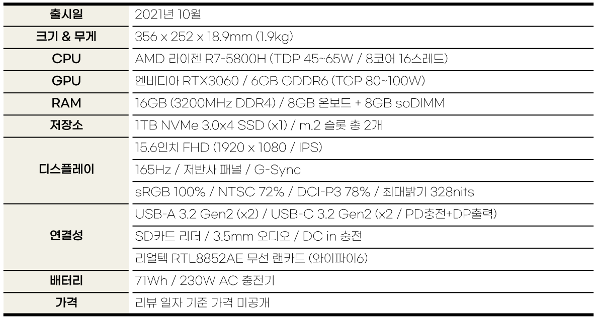 보통 R7-5800H + RTX3060 사양의 게이밍 노트북은 가격이 140~180만원 정도이긴 하지만, 일반적으로 경량 게이밍 노트북은 가격이 더 비싸다는 점을 감안하면 납득할 수 있는 가격 범주 내라고 생각합니다. 비슷한 구성의 경량 게이밍 노트북인 에이수스 제피러스 G15도 200만원 전후의 가격이기도 하고요.