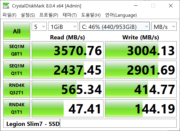기본적으로 탑재된 SSD는 삼성 1TB NVMe PCIe3x4 규격이었습니다. 아마 PM981a 모델이 아닐까 싶은데, 역시나 속도 테스트 결과도 준수하게 나왔네요. 추가 NVMe 슬롯도 있으니 용량이 부족하다고 느낄 경우 손쉽게 확장할 수 있습니다.