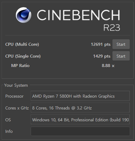 CPU 전력 설정이 높기 때문에 어지간한 중형급 게이밍 노트북과 견줄 수 있을 정도로 벤치마크 점수가 잘 나왔습니다. 동일한 R7-5800H가 장착된 리전5프로도 성능을 정말 잘 뽑아내는 모델 중 하나였는데, 리전 슬림7은 거의 600g이 더 가벼운 설계인데도 점수 차이가 거의 나지 않네요.