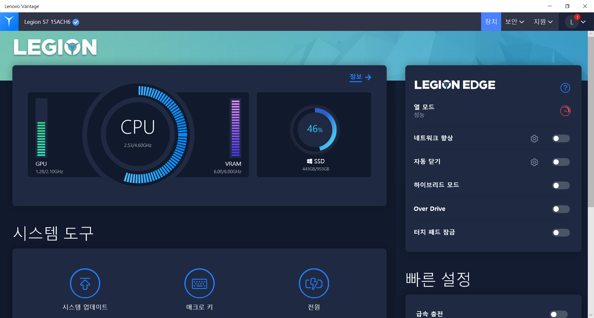 다만 레노버 리전 시리즈 모두 노트북 성능 모드가 딱 극한 성능 / 지능형 냉각 / 배터리 절약으로 3가지 모드밖에 없고, 사용자가 수동으로 팬 속도 조절을 할 수 없다는 점은 항상 아쉽네요.
