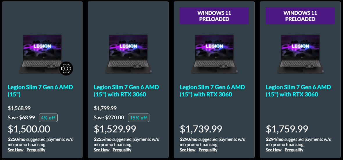 아직 리전 슬림7의 국내 출시 가격이 공개되지는 않았지만, 미국 공식 홈페이지의 가격을 보면 윈도우 OS 미포함 RTX3060 모델은 $1,529(한화 약 180만원) 정도네요. 국내 전파인증 및 유통비까지 포함하면 200만원 정도에 출시하지 않을까 예상해볼 수 있겠죠.