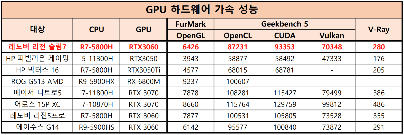 3D 그래픽, 영상 편집 작업의 지표가 되는 OpenGL, OpenCL 점수도 준수하게 나왔습니다. 리전5 프로처럼 TGP가 130W까지 올라가는 모델과 비교하면 약간 점수가 떨어지지만, 그래도 80~100W 급의 RTX3060 모델 중에서는 평균적인 수준이에요.