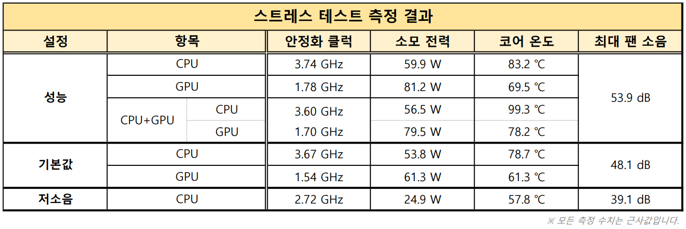 하지만 무조건 최고의 성능보다는 CPU 전력을 약간만 더 낮게 설정했으면 표면 발열이나 스로틀링 문제가 훨씬 덜하지 않았을까 싶기는 해요. 그래도 이 문제는 사용자가 클럭제한 설정만 해주면 쉽게 해결이 가능하기도 하고, 추후 바이오스 업데이트로 해결이 될 가능성도 있기 때문에 치명적인 단점이라고 보기는 어려울 것 같아요. 이건 어디까지나 전력 설정의 문제이지, 내부 쿨링 설계가 나쁜 것은 아니니까요.
