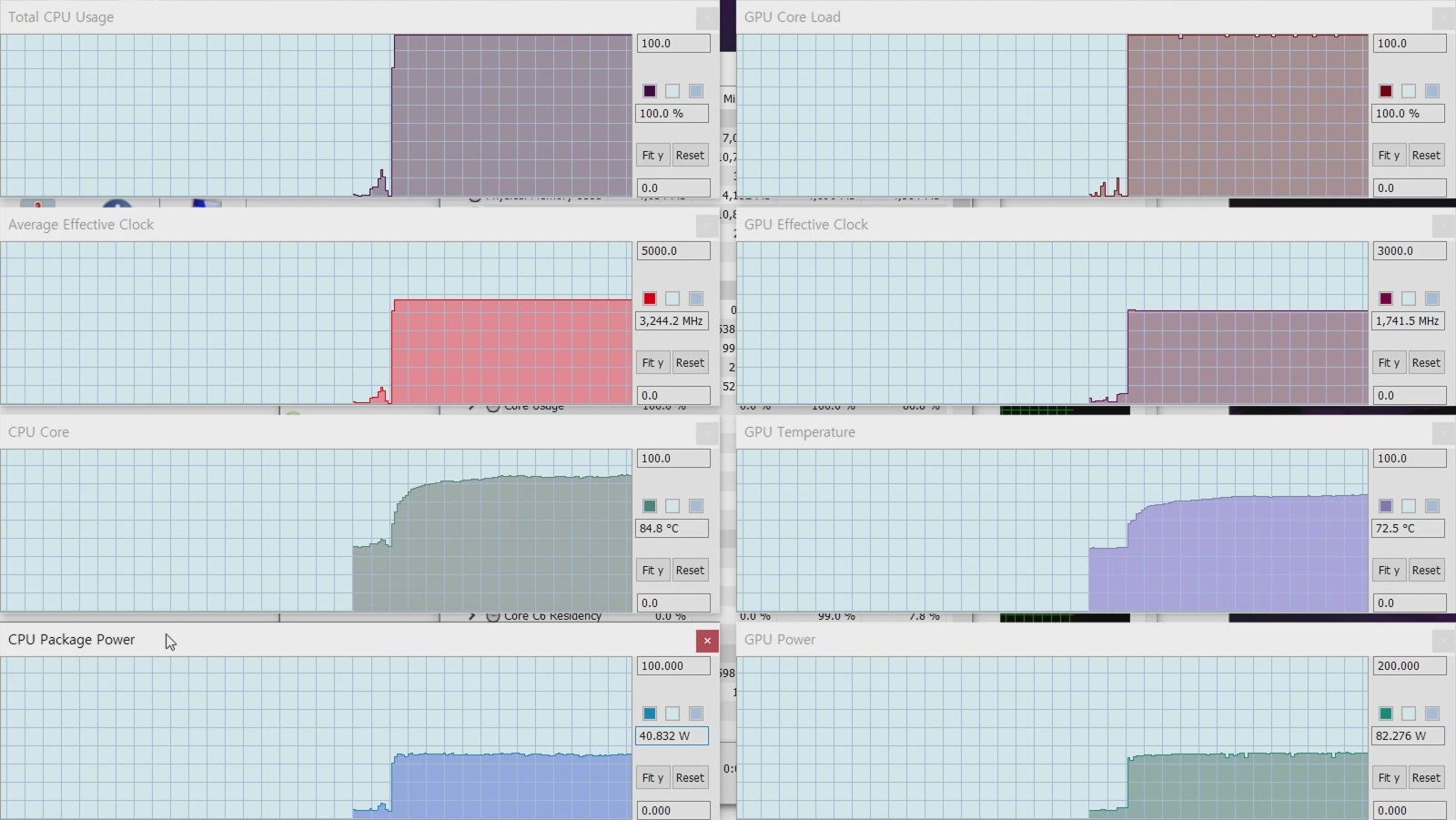 그런데 CPU와 GPU에 부하를 동시에 주게 되면 코어 온도가 99℃에 육박하면서 온도 스로틀링이 걸리는 모습을 보여주더라고요. 솔직히 라이젠 CPU는 35~45W 정도만 공급해도 충분히 만족스러운 성능이 나오기 때문에 굳이 기를 쓰고 60W까지 목표로 잡았어야 하나... 싶은 생각이 조금 들긴 해요. 물론 전력 설정이 높은 것이 이론상 최대 성능이 잘 나오겠지만, 온도 스로틀링이 걸린다면 시스템 안정성이 떨어지게 되니까요.