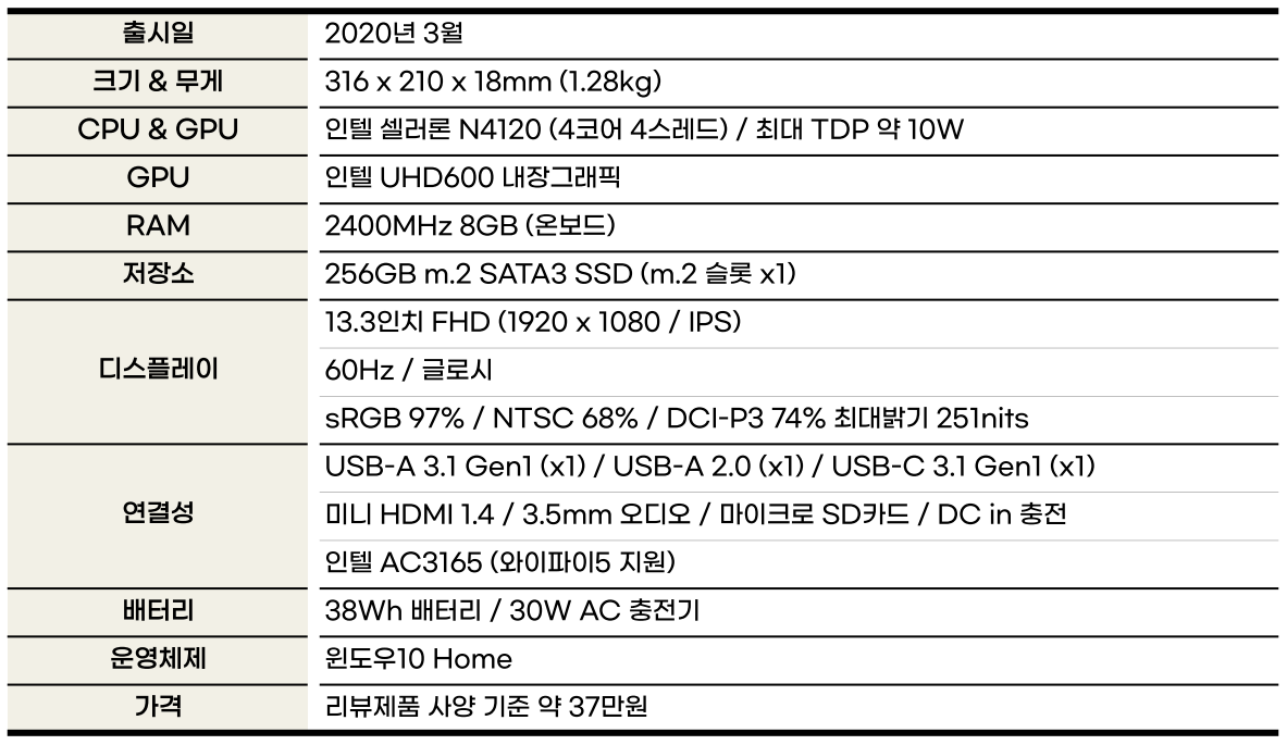 개인적으로 베이직북 13을 사용하면서 마감이나 디스플레이, 사용성 방면에서는 기대보다 좋았기 때문에 CPU만 셀러론보다 한 단계 더 높은 펜티엄 골드 정도만 사용했어도 의외로 추천할만한 모델이 되지 않았을까 하는 아쉬움이 남네요.