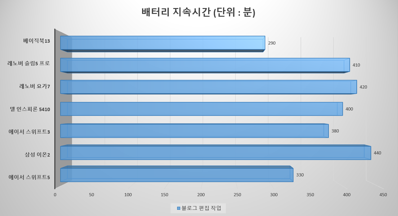 화면 밝기 100% (약 250nits) 상태로 블로그 편집 작업을 할 경우 배터리 상태로 약 5시간 정도 사용할 수 있었습니다. 요즘 저전력 노트북들은 7시간 이상 버티는 경우가 많기 때문에 약간 아쉬운 수준이라고 할 수 있겠죠. 아무래도 배터리가 38Wh로 용량이 물리적으로 적기 때문이지 않을까 싶습니다.