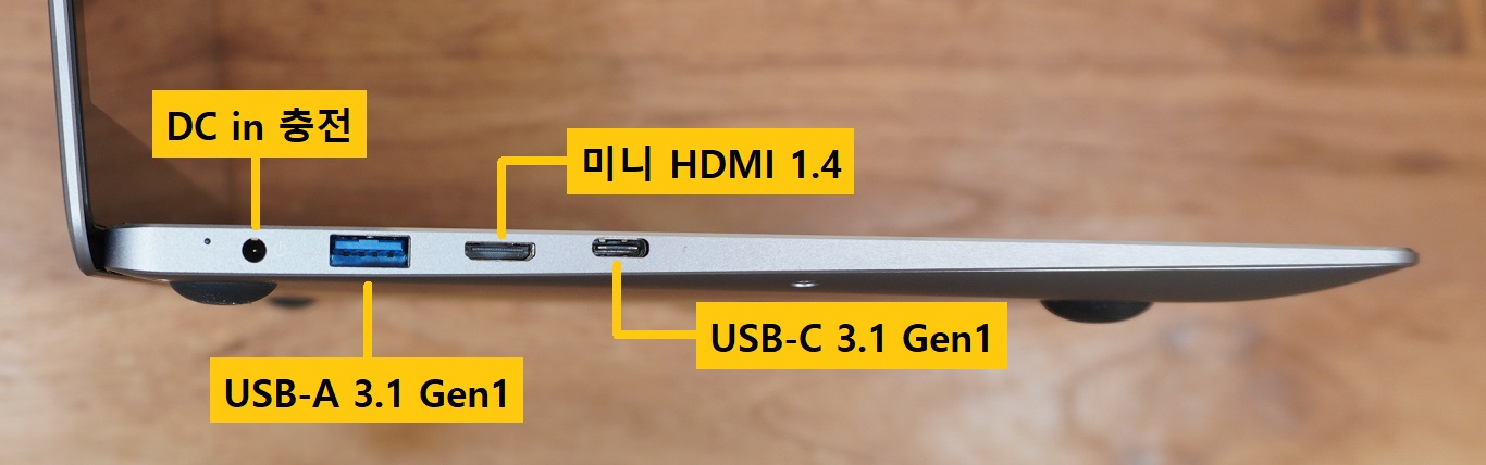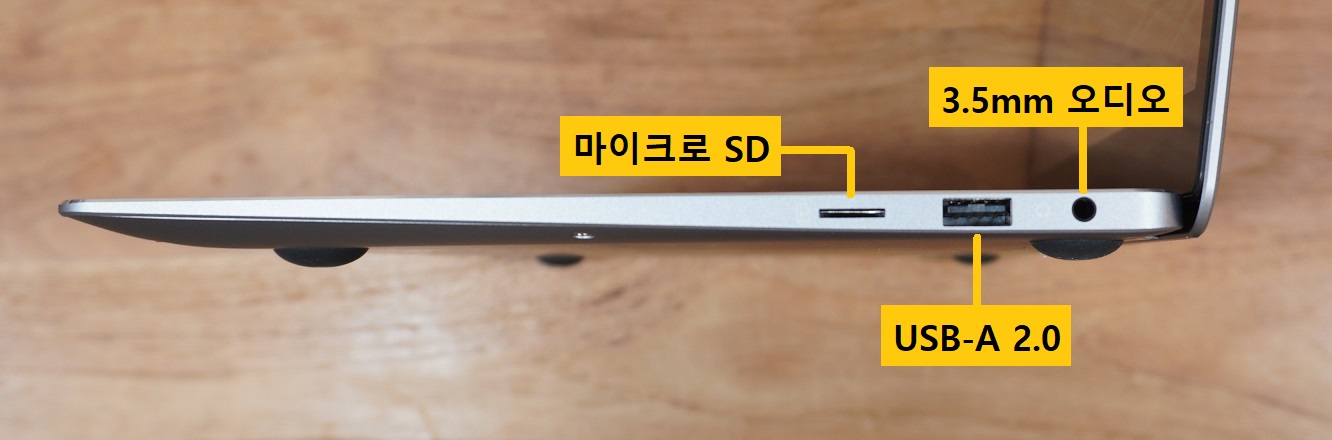 언뜻 보기에 휴대용 13인치 노트북치고는 있을 만한 포트는 다 있습니다. USB-A 2개, USB-C 1개, HDMI에 마이크로 SD 슬롯까지... 그런데 자세히 보면 USB-A 중 1개는 속도가 느린 2.0 세대이고, HDMI도 미니 HDMI 방식이라서 케이블을 따로 장만해야 한다는 불편함이 있습니다.