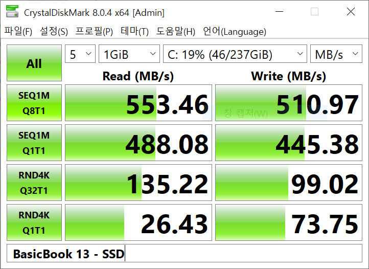 기본적으로 장착된 SSD가 m.2 SATA3 규격이라서 요즘 흔히 사용하는 NVMe 방식보다 측정 속도는 많이 떨어집니다. (일반적인 NVMe SSD는 1500~3000MB/s) 하지만 대부분의 사용자는 500MB/s 이상의 속도를 사용할 일도 많이 없을뿐더러 셀러론 N4120 프로세서의 성능으로는 NVMe SSD의 속도를 감당할 수도 없을 것이기 때문에 크게 불만스러운 요소는 아니라고 생각해요.