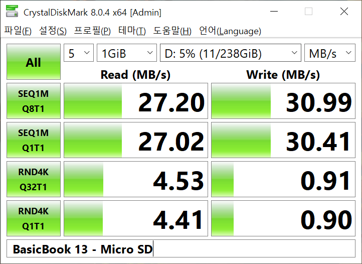 가끔 마이크로SD 카드 슬롯을 통해서 손쉽게 저장소 용량을 확장하고자 하는 분들도 계실 것 같은데, 속도가 처참할 정도로 느리니까 그냥 마이크로 SD 슬롯은 없다고 생각하고 사용하시는 게 좋지 않을까 싶어요. 용량이 아쉽다면 차라리 SSD 교체 장착이 낫습니다.
