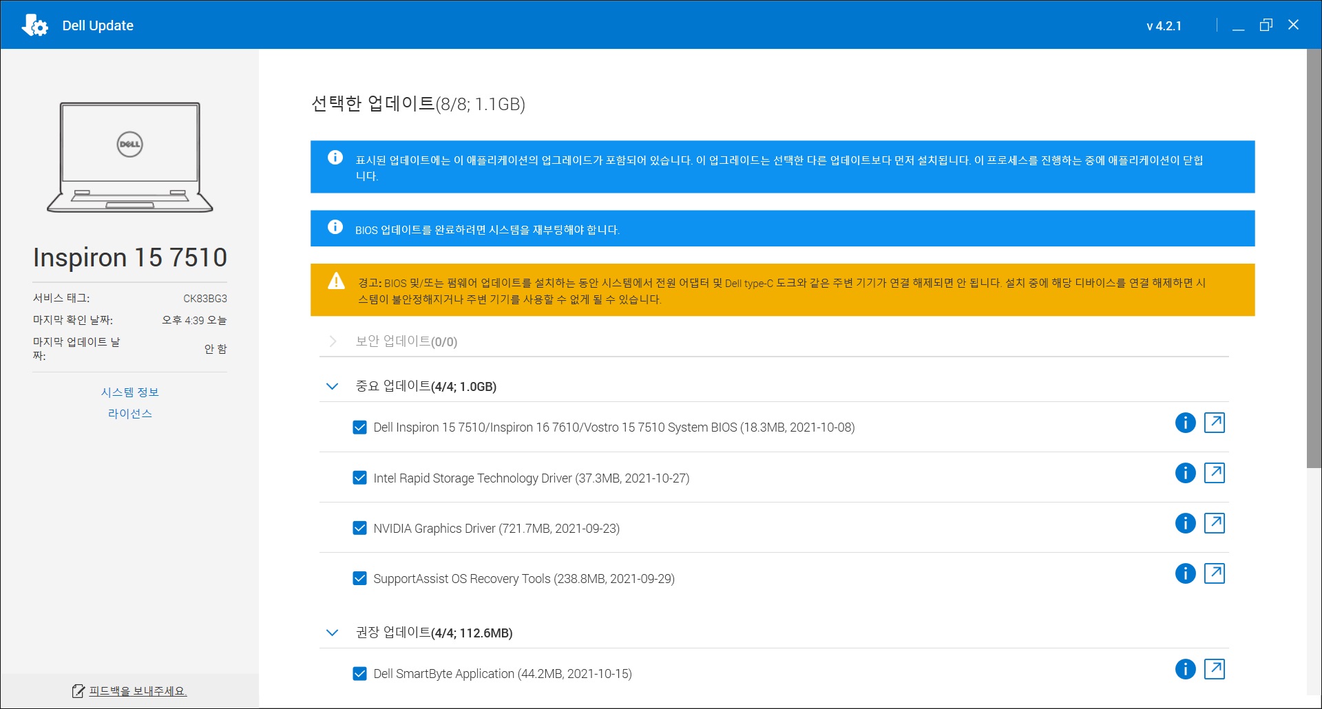 기본적으로 제공되는 My Dell 프로그램이 생각보다 기능이 다양해서 노트북 초보자도 쉽게 세팅할 수 있겠더라고요. 원클릭 드라이버 업데이트는 물론 배터리 충전 제한, 성능 모드 변경, 시스템 최적화, AS 신청 등 다양한 메뉴가 존재해서 기능적으로 아쉽다고 느껴질 일은 없을 것이라고 생각합니다.