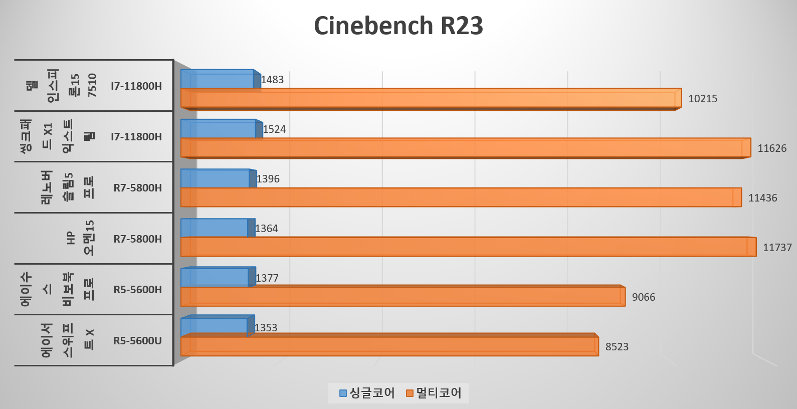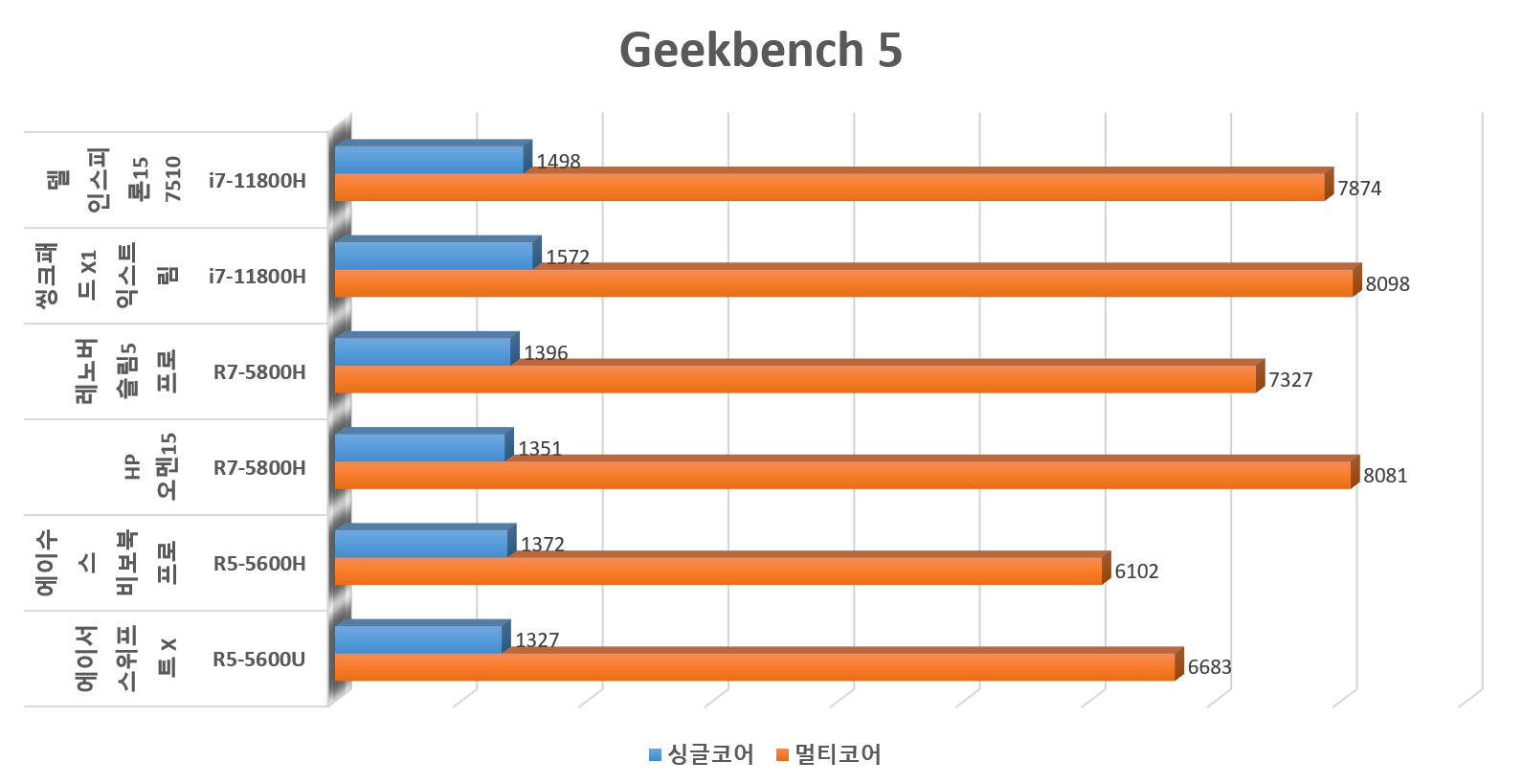 확실히 싱글코어 성능은 인텔 타이거레이크가 라이젠 세잔을 상회하는 모습입니다. 하지만 인스피론 7510은 크리에이터 노트북 치고는 상대적으로 GPU에 전력 배분 비율이 높은 편이어서 동일한 CPU를 사용하는 씽크패드 X1 익스트림 모델보다는 멀티코어 점수가 살짝 낮게 나왔습니다.