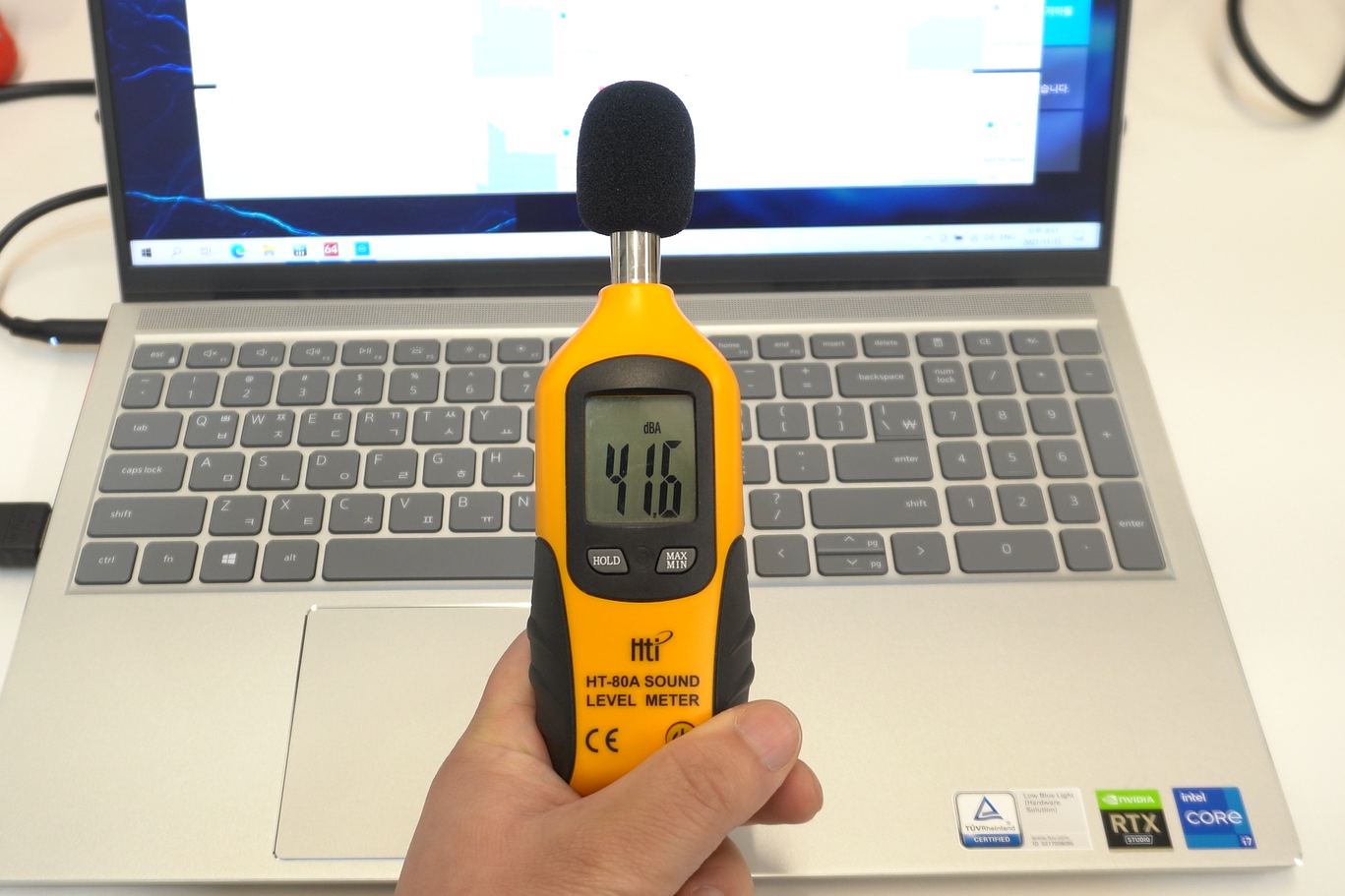 제가 예상했던 것보다 소음과 표면 발열이 심하지는 않았습니다. 초고성능 모드에서는 팬 소음이 최대 50dB 내외까지 올라가기 때문에 게이밍 노트북 수준이긴 하지만, 성능 모드를 낮추면 어지간한 휴대용 저전력 노트북 수준까지 조용해집니다. "방해금지" 모드 기준으로 가벼운 문서, 인터넷 작업만 한다면 거의 무소음 수준이라서 독서실 같은 조용한 장소에서도 충분히 사용이 가능했습니다.