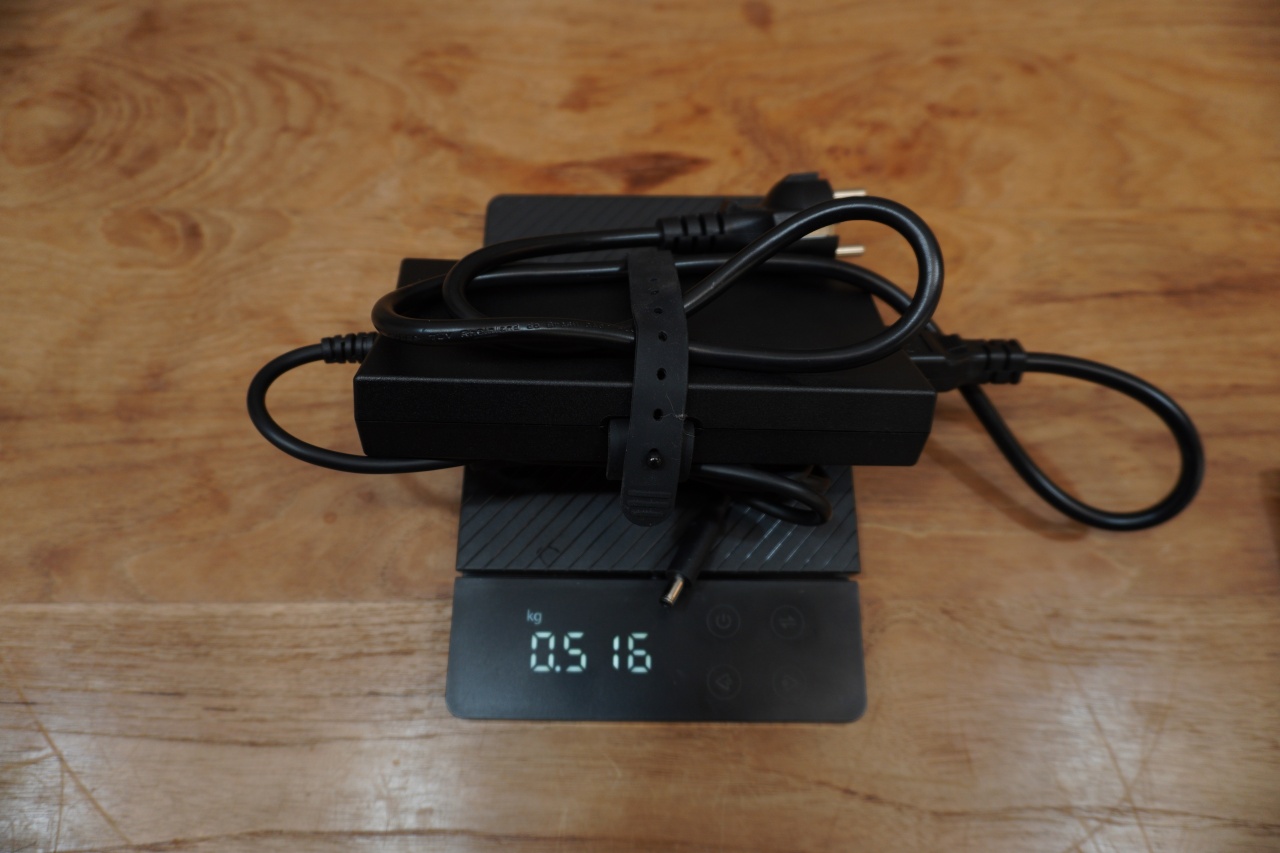 기본 충전기는 130W 규격이라서 무겁지는 않은데, 출력에 비해서 크기가 약간 큰 편이에요. 어지간한 180W 게이밍 노트북 충전기와 비슷한 크기 정도...? 노트북을 주로 백팩에 수납하고 다닌다면 어차피 크기보다는 무게가 더 중요할 테니 충전기 휴대성은 그럭저럭 나쁘지 않다고 볼 수는 있겠습니다. 그리고 소소한 보너스로 케이블 정리용 고무 밴드가 달려 있다는 점도 마음에 들고요.