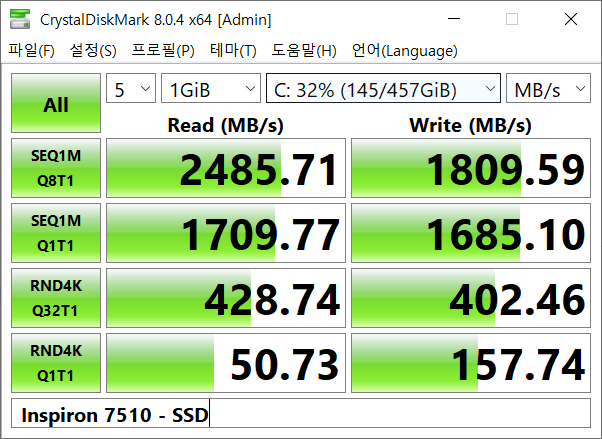 그런데 SD카드 슬롯이 의외로 25MB/s 수준이더라고요? 솔직히 크리에이터 노트북이면 기본적으로 90MB/s 내외를 기대하기 마련인데, 이건 조금 아니다 싶었어요. 인스피론 7510 모델이 게이밍 노트북도 아니고, 애초에 SD카드를 자주 활용할만한 수요층을 공략하는 제품인데도 SD카드 슬롯 원가절감은 글쎄요...