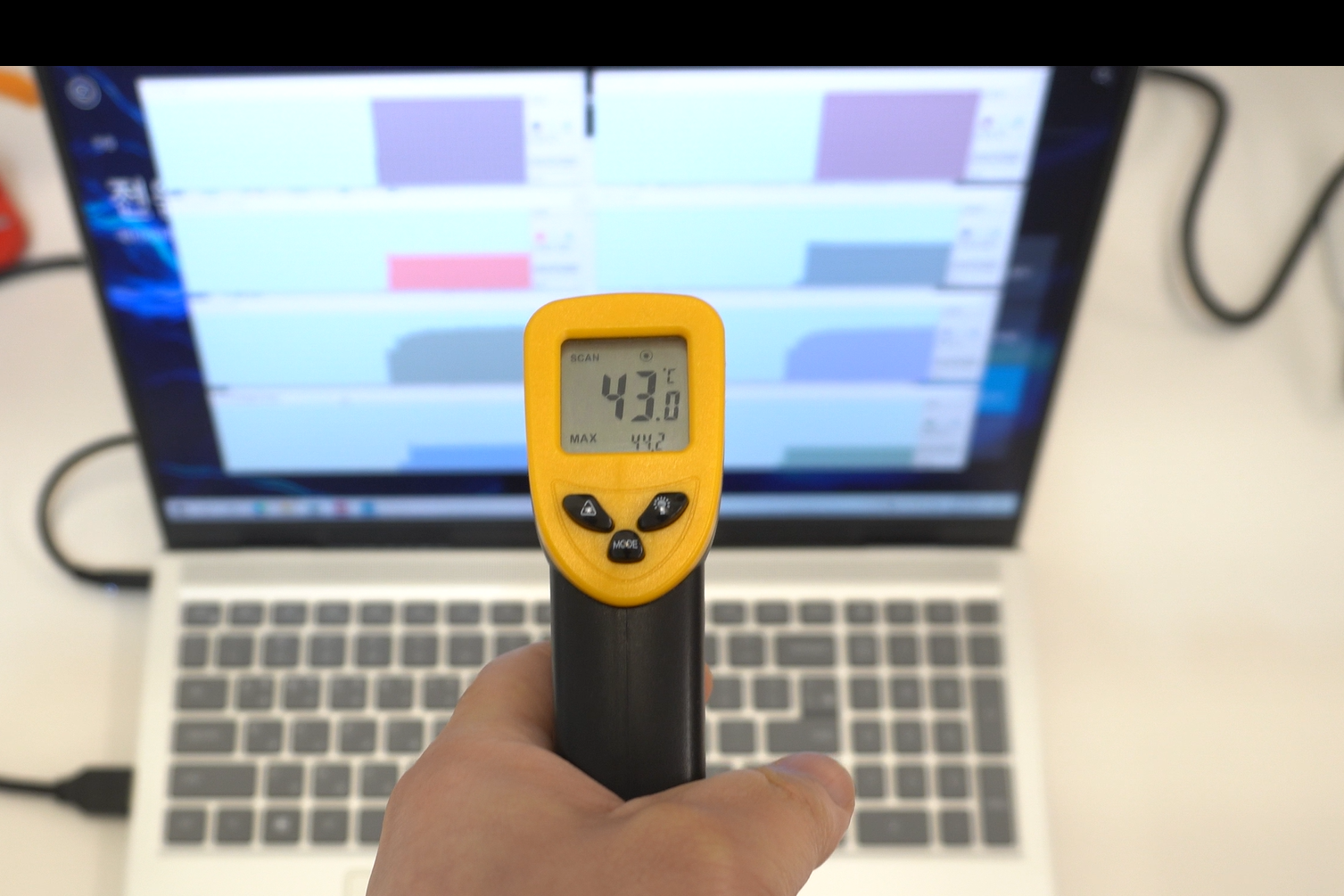 표면온도 역시 키보드 중앙 상단부가 43~44도 정도로 다소 높은 편이었지만, 손이 자주 닿는 부위도 아니고 WASD 키와 넘버패드 주변부는 37~38도 정도로 양호하게 측정됐습니다. 최악의 상황 기준으로도 조금 따뜻 미지근하다 정도로 생각해주시면 되겠습니다.