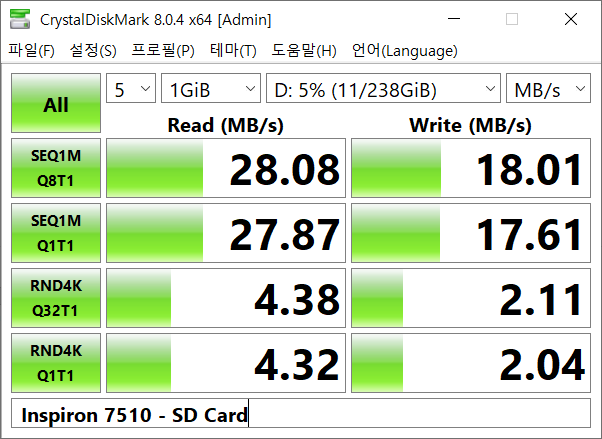 저는 SD카드로 4K 영상을 자주 옮기기 때문에 이 정도 속도면 그냥 USB 아답터를 따로 구매해서 SD 카드를 사용하게 될 것 같아요. 조금 과장 보태서 말하자면 인스피론 7510의 SD카드는 노트북 측면의 포트 공간만 차지하는 애물단지 느낌이랄까요?