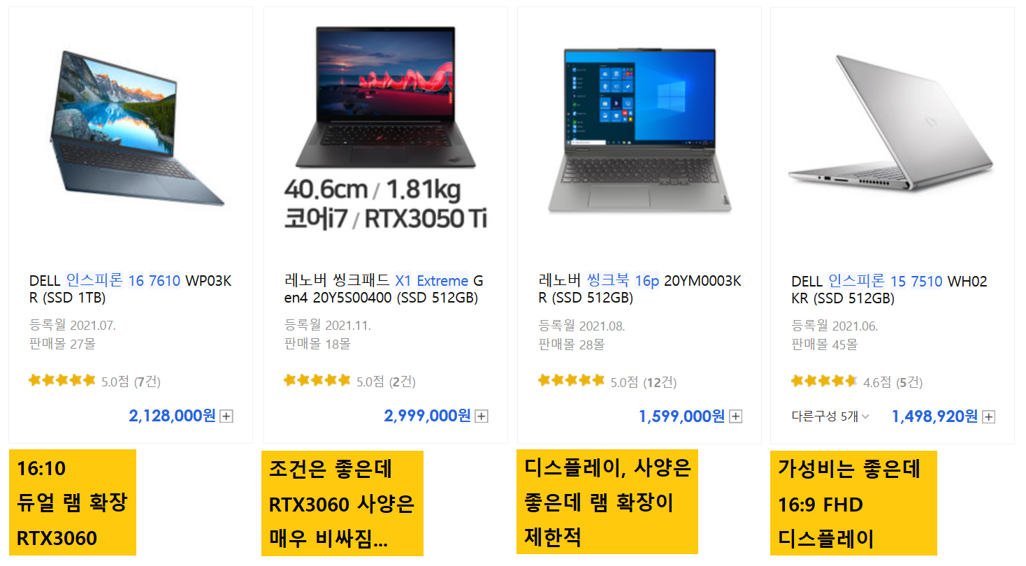 나열하고 보니 생각보다 많긴 하네요. 그럼에도 불구하고 확장성 좋고 어느 정도 휴대성도 확보되는 16인치급 크리에이터 노트북을 원하신다면 사실상 150~200만원 가격대에서는 레노버 씽크북 16P와 델 인스피론16 7610 정도가 가장 유력한 후보라는 점에는 변함이 없습니다. 각 모델의 장단점도 뚜렷하게 나눠지기도 하니 취향에 따라 선택해도 된다고 보는 것이 맞겠죠.