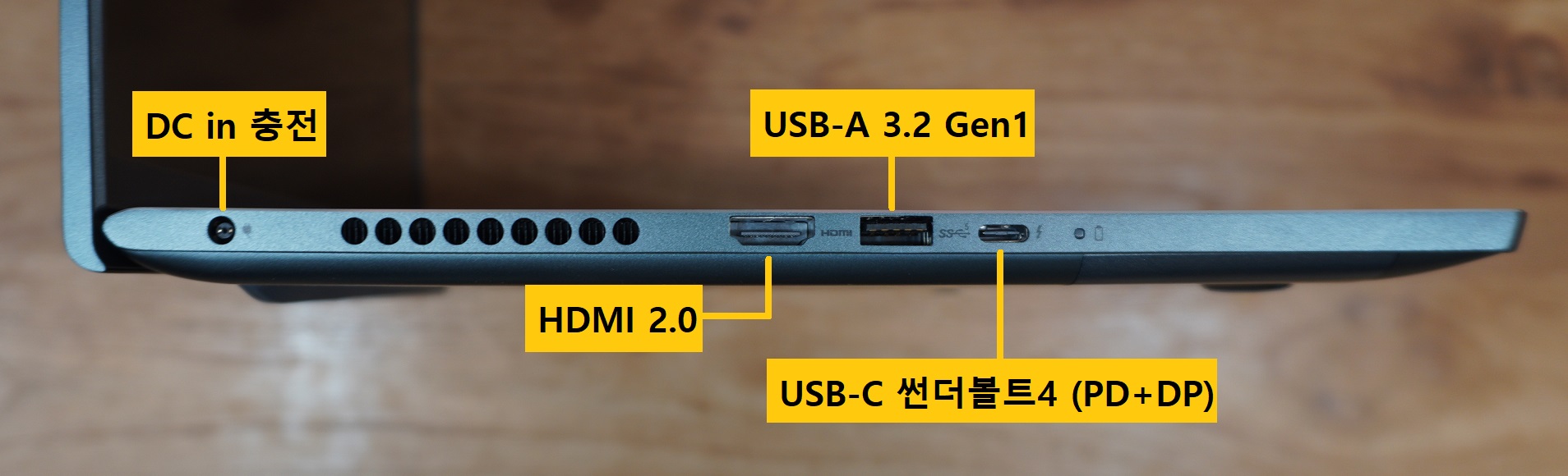 포트 구성과 배치 자체는 나쁘지 않습니다. USB-A가 양쪽에 1개씩, 왼쪽의 USB-C는 썬더볼트4 규격에 PD 충전, 디스플레이 출력까지 되는 구성이고 HDMI와 SD카드 리더까지 있으니 크리에이터 노트북 용도로는 나무랄 구석이 없다고 할 수 있겠죠.