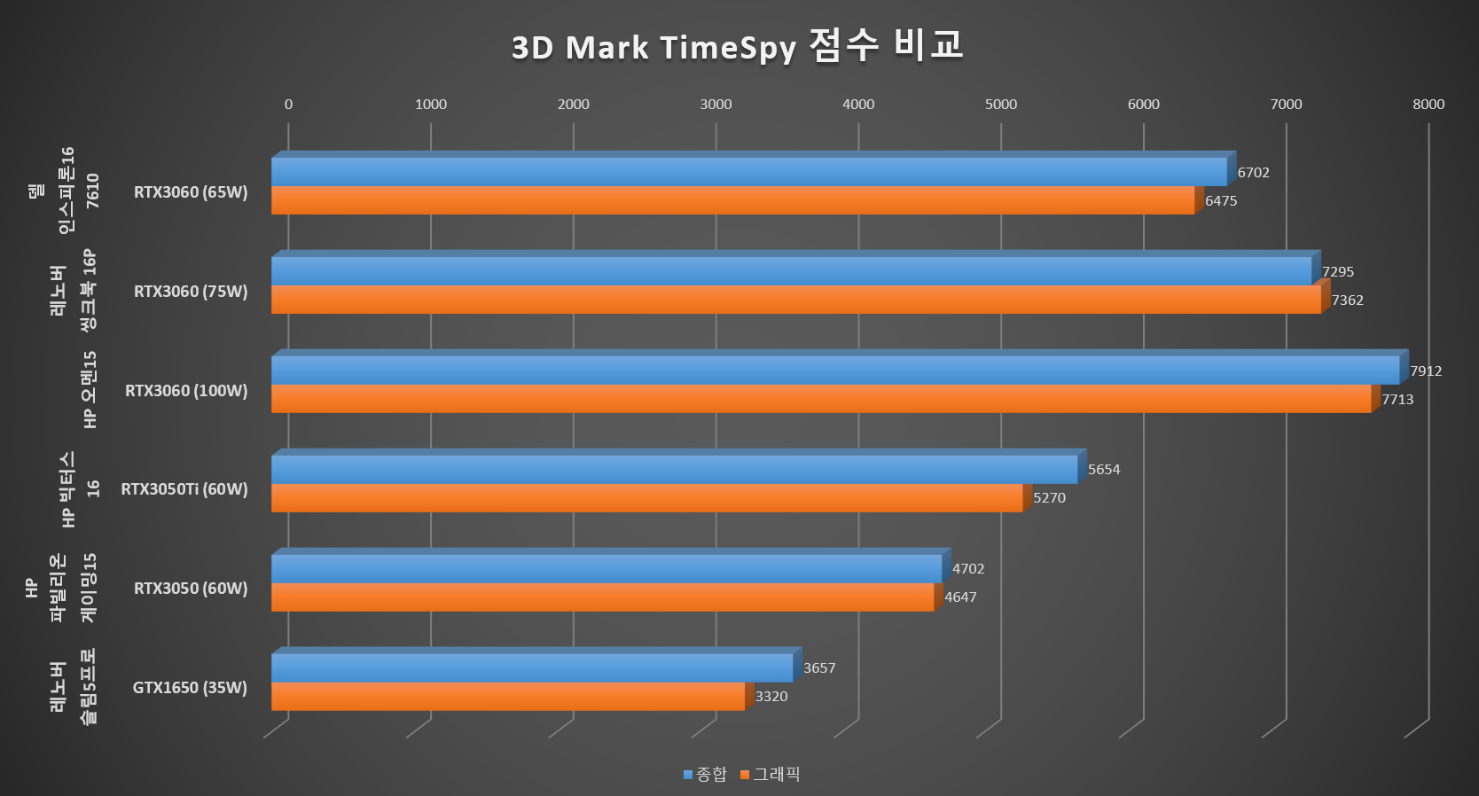 아무래도 TGP(그래픽 전력)가 RTX3060 치고는 상당히 낮은 65W로 설정되어 있기 때문에 확실히 그래픽 성능 방면에서는 아쉬운 모습을 보여줍니다. 사실상 RTX3060보다는 조금 오버클럭 된 RTX3050Ti 느낌에 가깝다고 보는 것이 맞을 것 같네요.